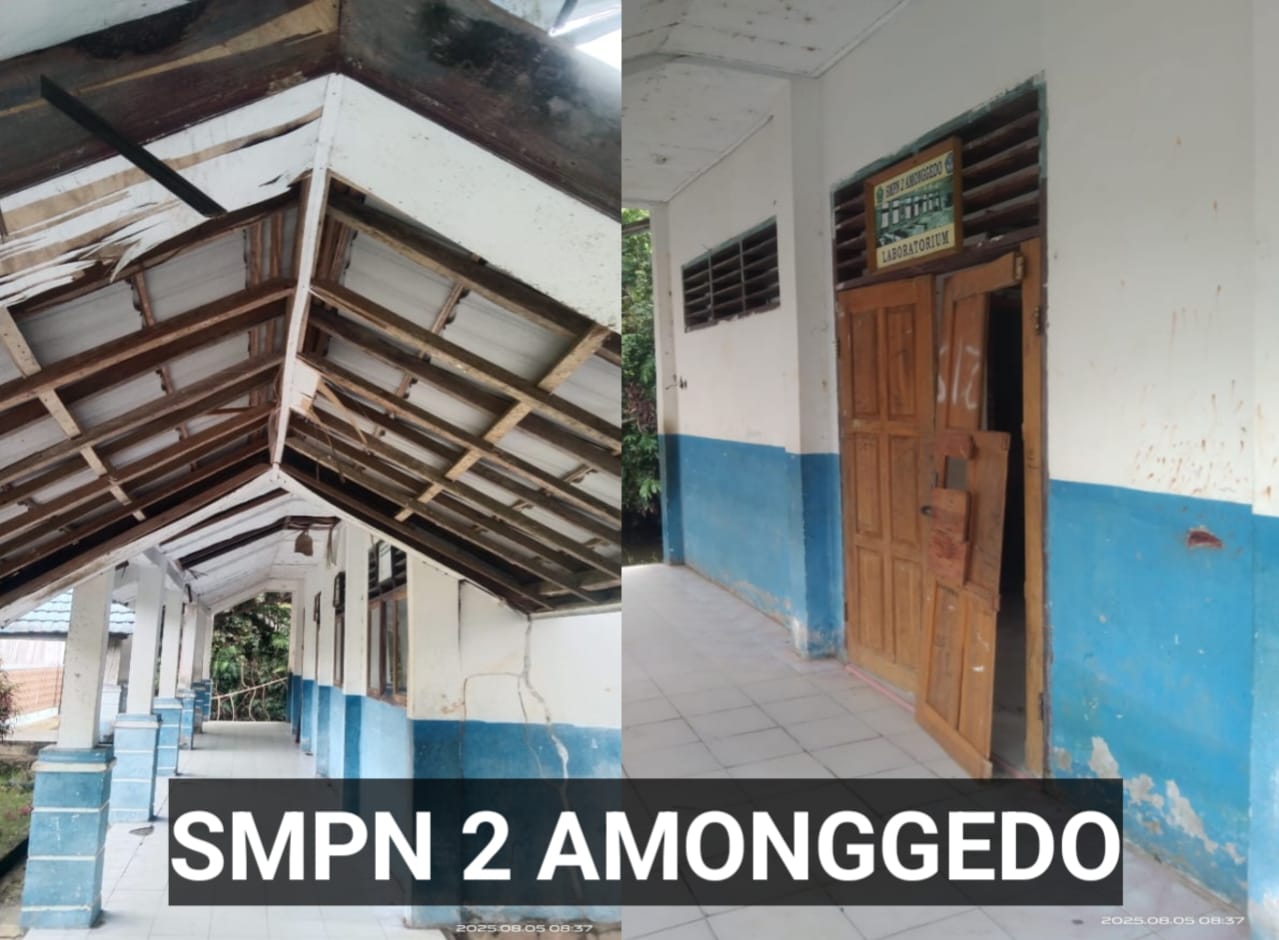 Kondisi ini terjadi di SMP Negeri 2 Amonggedo, yang terletak di Kecamatan Amonggedo, Kabupaten Konawe. Berdasarkan laporan warga setempat, sejumlah bangunan sekolah mengalami kerusakan parah, bahkan dinilai membahayakan keselamatan siswa.