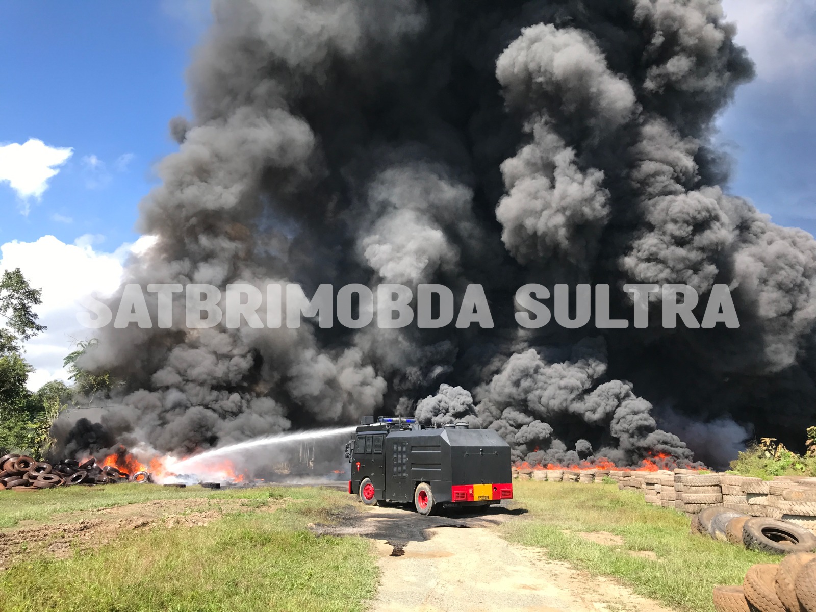 Dalam operasi pemadaman tersebut, Brimob bersama Dinas Pemadam Kebakaran Kota Kendari, Damkar Kabupaten Konawe Selatan, serta komunitas pemilik mobil tangki air bekerja sama memadamkan kobaran api yang membakar ribuan ban bekas di lahan seluas sekitar 2,5 hektare.