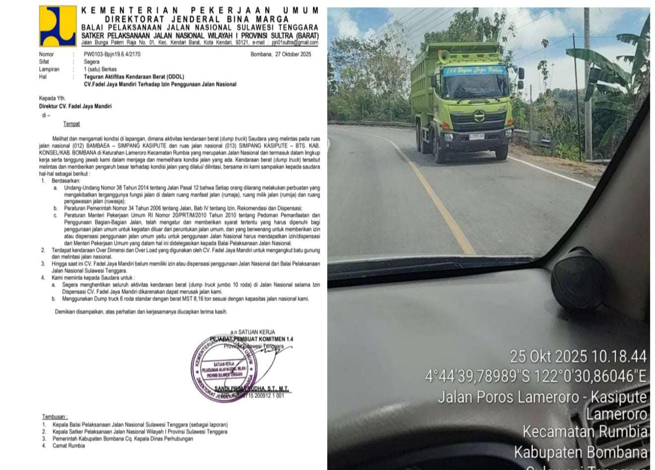 “Pengoperasian kendaraan berat dengan muatan berlebih berpotensi mempercepat kerusakan jalan. Hal ini dapat menurunkan kualitas dan umur layanan jalan nasional,” demikian isi surat teguran BPJN Sultra yang ditandatangani pejabat berwenang.
