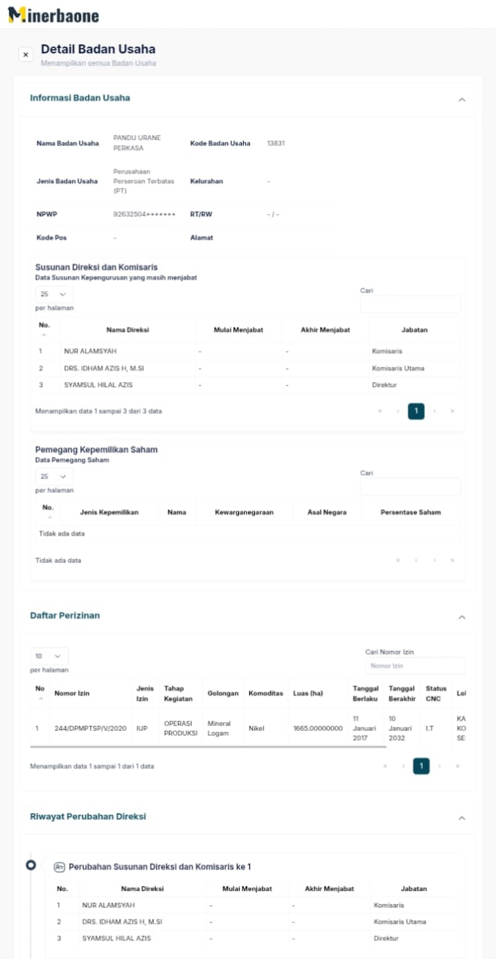 Tim redaksi media ini kemudian melakukan penelusuran melalui situs resmi Minerba One Data Indonesia (MODI) ESDM, dan ditemukan bahwa Komisaris Utama PT Pandu Urane Perkasa tercatat atas nama Drs. Idham Azis, M.Si.