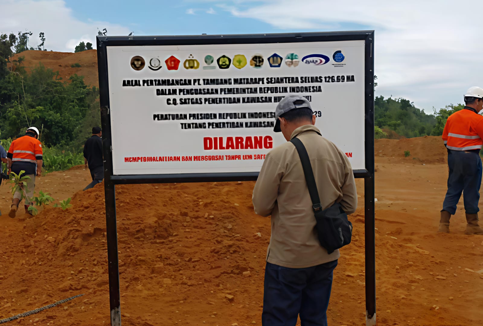 “Areal Pertambangan PT Tambang Matarape Sejahtera seluas 126,69 Ha dalam penguasaan Pemerintah Republik Indonesia Cq. Satgas Penertiban Kawasan Hutan. Dilarang memperjualbelikan dan menguasai tanpa izin Satgas Penertiban Kawasan Hutan.”