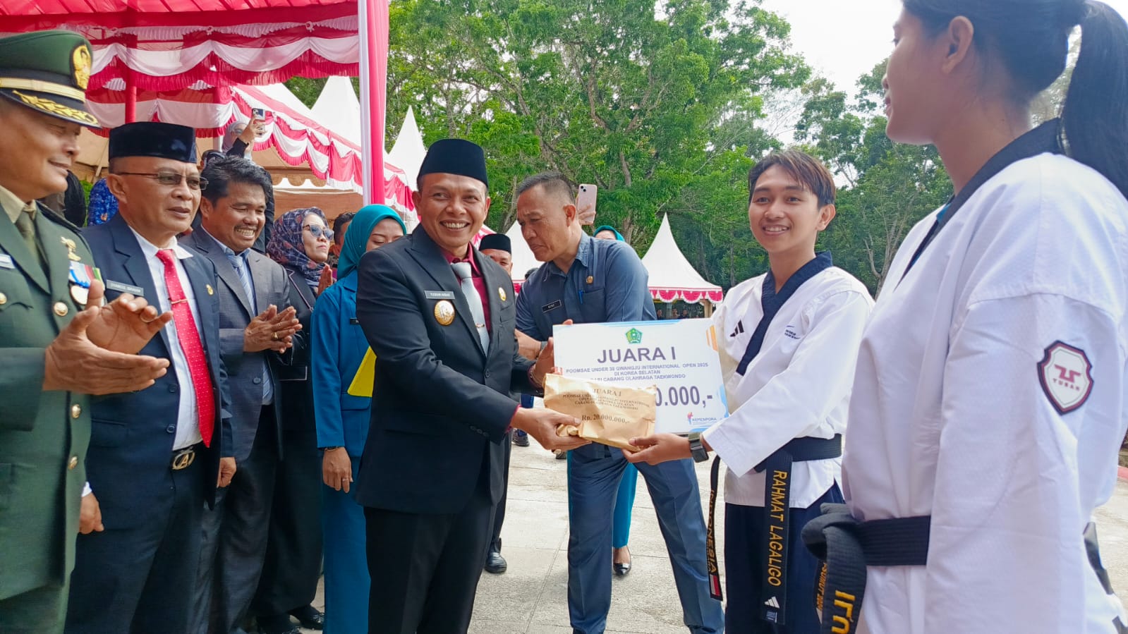 Sebagai bentuk apresiasi terhadap semangat dan prestasi generasi muda, Bupati dan Wakil Bupati Konawe menyerahkan piagam penghargaan dan uang tunai kepada dua atlet muda berprestasi yang telah mengharumkan nama Kabupaten Konawe di tingkat nasional dan internasional.