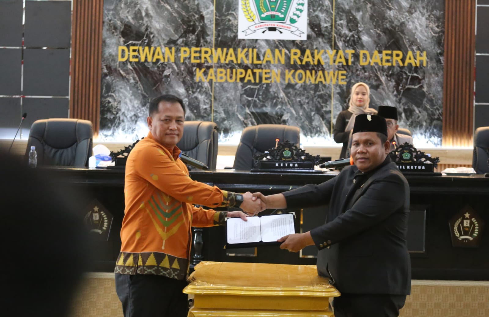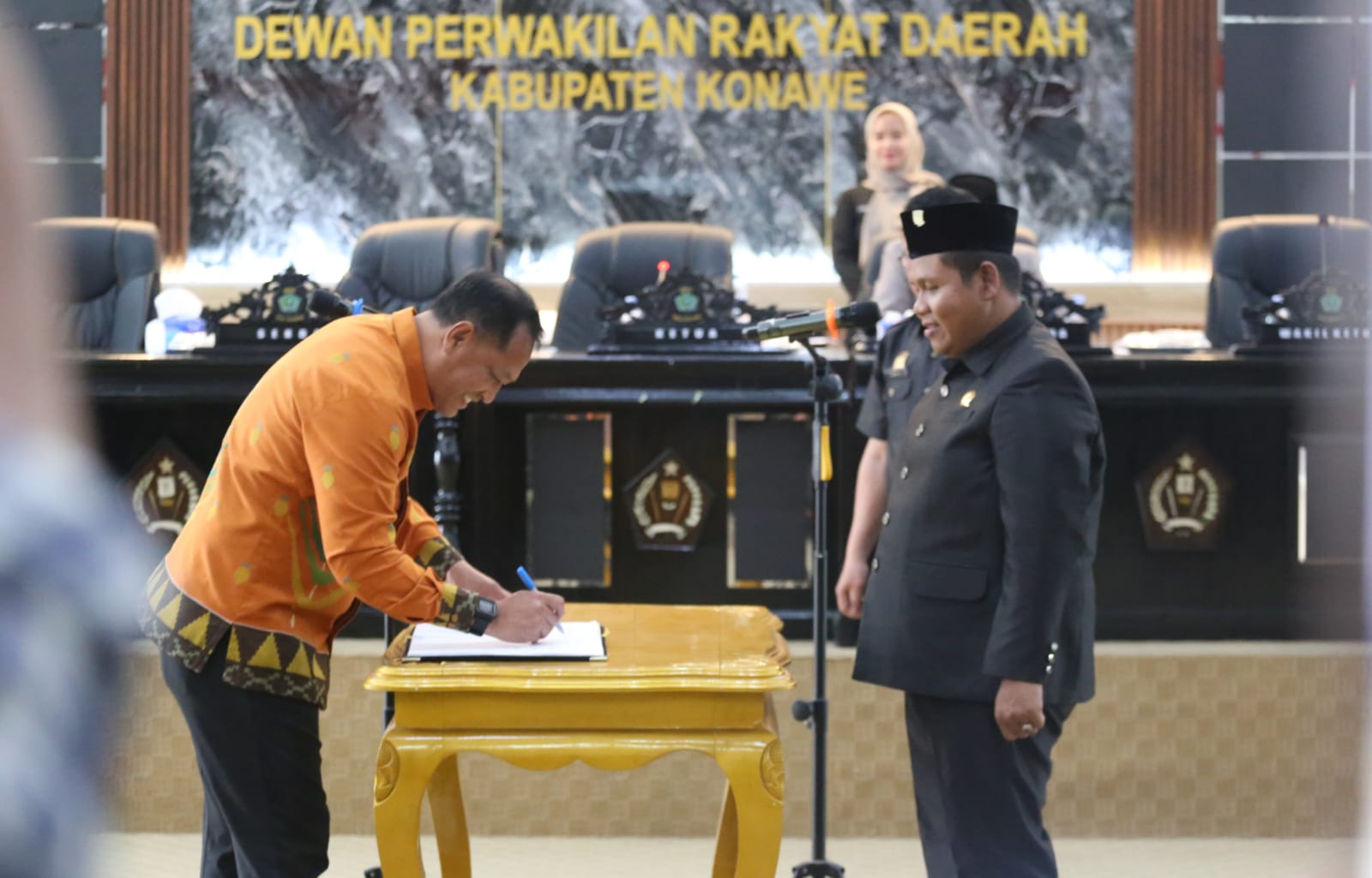 Penandatanganan dokumen kesepahaman dilakukan langsung oleh Ketua DPRD Konawe, I Made Asmaya, sementara dari pihak eksekutif diparaf oleh Sekretaris Daerah karena Bupati berhalangan hadir.