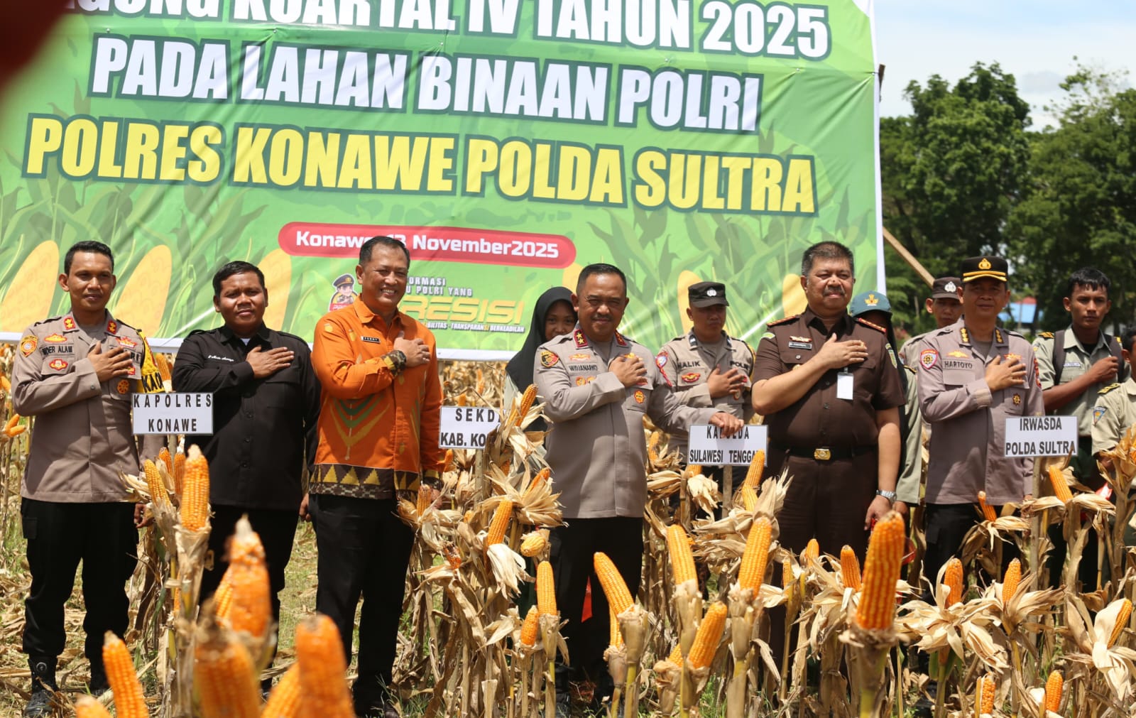 SUARASULTRA.COM | KONAWE – Kapolda Sulawesi Tenggara (Sultra) Irjen Pol Didik Agung Widjanarko, S.IK., M.H., bersama jajaran Pejabat Utama (PJU) Polda Sultra melaksanakan panen raya jagung kuartal IV tahun 2025 di lahan binaan Polri, Polres Konawe.