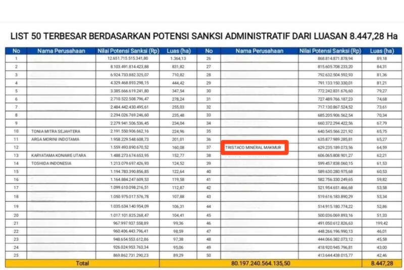 Sanksi tersebut diberikan menyusul temuan bukaan kawasan hutan seluas 64,69 hektare yang dilakukan oleh perusahaan tambang tersebut. PT Tristaco Mineral Makmur diketahui beroperasi di wilayah Kabupaten Konawe Utara (Konut), Provinsi Sulawesi Tenggara (Sultra).