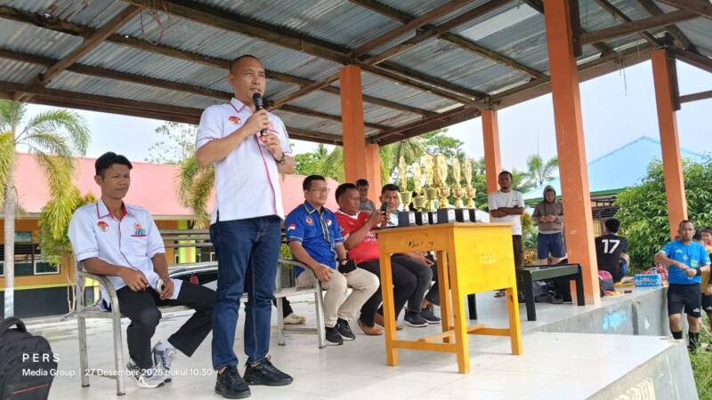 Ketum KONI Konawe, Rusdianto, SE, MM saat membuka Turnamen Battle Of Champions di Lapangan Sepak Bola Puday, Sabtu 27 Desember 2025.