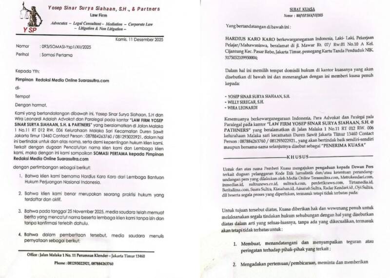 SUARASULTRA.COM | KENDARI – Menanggapi surat somasi Law Firm Yosep Sinar Surya Siahaan, S.H.& Partners Kuasa Hukum Hardius Karo Karo yang dikirimkan kepada awak media kami.