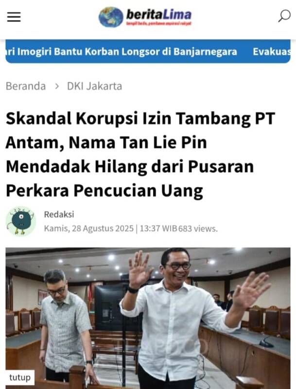 Skandal Korupsi Izin Tambang PT Antam, Nama Tan Lie Pin Mendadak Hilang dari Pusaran Perkara Pencucian Uang – BERITALIMA.COM