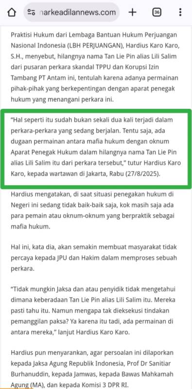 Salah satunya kami kutip pernyataan Hardius Karo Karo pada media Beritalima.com dengan judul “Skandal Korupsi Izin Tambang PT Antam, Nama Tan Lie Pin Mendadak Hilang dari Pusaran Perkara Pencucian Uang” dengan link berita berikut :