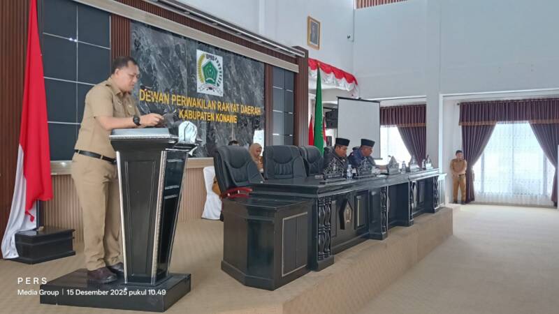 Kesiapan tersebut disampaikan Sekretaris Daerah (Sekda) Kabupaten Konawe, Dr. Ferdinand, S.P., M.H., saat menghadiri Rapat Paripurna DPRD Konawe dengan agenda penyerahan dokumen Rancangan Peraturan Daerah (Raperda) Bantuan Hukum untuk Masyarakat Miskin usulan Pemerintah Daerah, serta enam Raperda inisiatif DPRD, Senin (15/12/2025).
