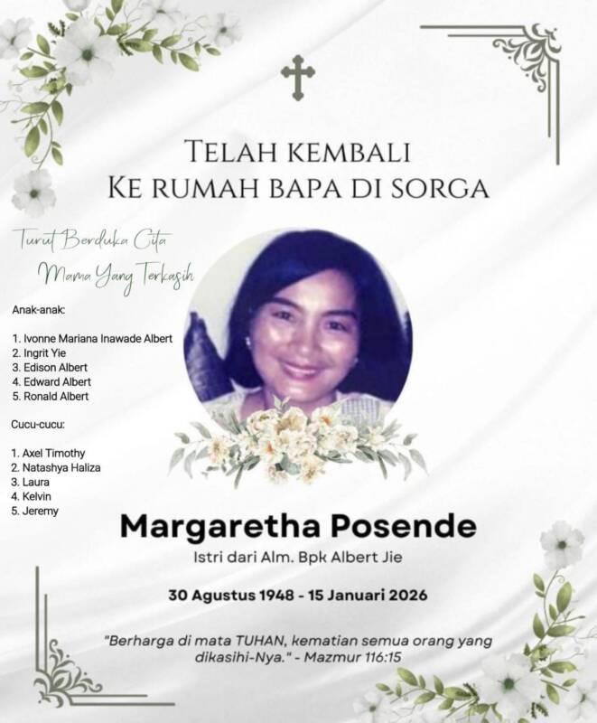 “Atas kehadiran dan doa penghiburan dari Bapak, Ibu, serta Saudara(i), kami sekeluarga mengucapkan terima kasih. Tuhan memberkati,” ucapnya.