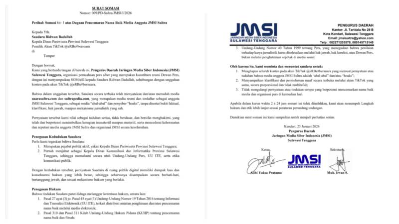 Somasi dilayangkan menyusul unggahan akun TikTok @eRBeBersuara, yang diketahui dimiliki oleh Ridwan Badallah, yang diduga mencatut dan melabeli dua media anggota JMSI Sultra, yakni Suarasultra.com dan Sultrapedia.com, sebagai media “abal-abal” dan penyebar hoaks.