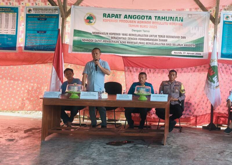 SUARASULTRA.COM | KONAWE – Kepala Dinas Koperasi dan UMKM Kabupaten Konawe, H. Djabal Nur Moita, SE, secara resmi membuka Rapat Anggota Tahunan (RAT) Tahun Buku 2025 Koperasi Produsen Agrindo Besulutu Konawe, Sabtu (31/1/2026).