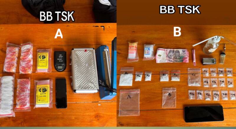 Selain narkotika, polisi juga mengamankan sejumlah barang bukti lain berupa alat isap sabu, timbangan digital, alat bantu pengemasan, satu unit handphone, serta uang tunai yang diduga merupakan hasil transaksi narkoba.