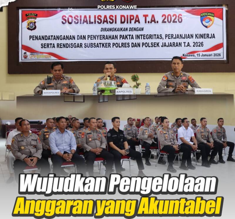 SUARASULTRA.COM | KONAWE – Kepolisian Resor (Polres) Konawe, Polda Sulawesi Tenggara (Sultra), menggelar kegiatan sosialisasi Daftar Isian Pelaksanaan Anggaran (DIPA) Tahun Anggaran 2026 yang dirangkaikan dengan penandatanganan Pakta Integritas, Perjanjian Kinerja, serta Rencana Distribusi Anggaran (Rendisgar) Subsatker Polres dan Polsek jajaran.