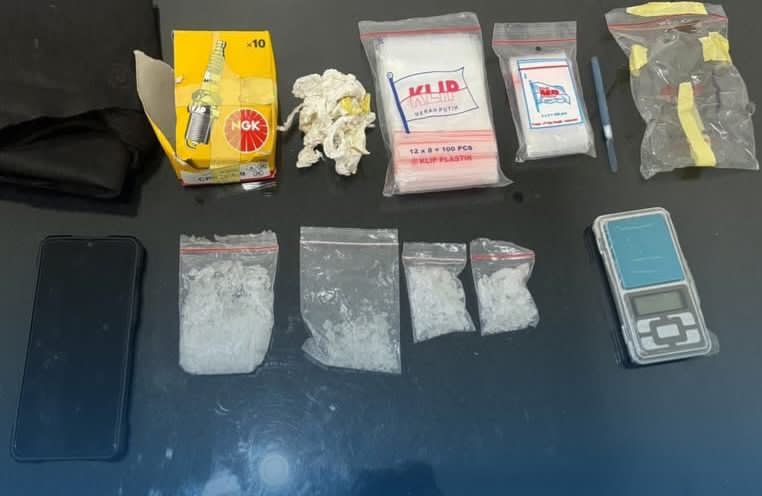 Selain sabu, aparat turut mengamankan sejumlah barang bukti lain yang diduga berkaitan dengan aktivitas peredaran narkotika, di antaranya satu unit telepon genggam, timbangan digital, puluhan saset plastik kosong berbagai ukuran, sendok sabu yang terbuat dari pipet, tisu, serta kotak pembungkus busi yang diduga digunakan untuk menyamarkan barang haram tersebut.