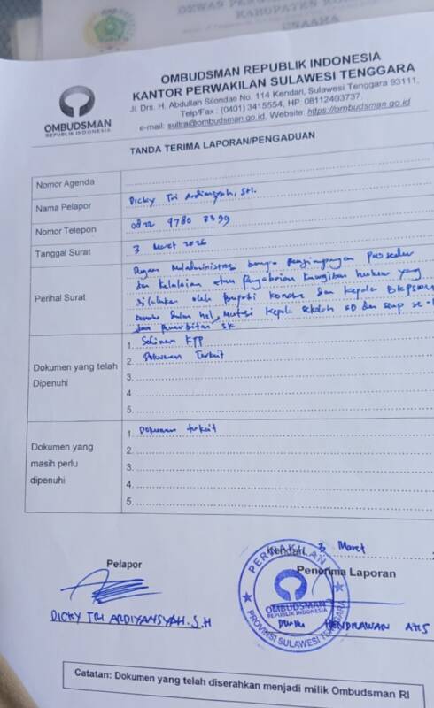 Laporan tersebut diajukan atas dugaan maladministrasi berupa penyimpangan prosedur dan pengabaian kewajiban hukum oleh Bupati Konawe dan Badan Kepegawaian dan Pengembangan Sumber Daya Manusia (BKPSDM) dalam penerbitan SK mutasi kepala sekolah SD dan SMP se-Kabupaten Konawe.