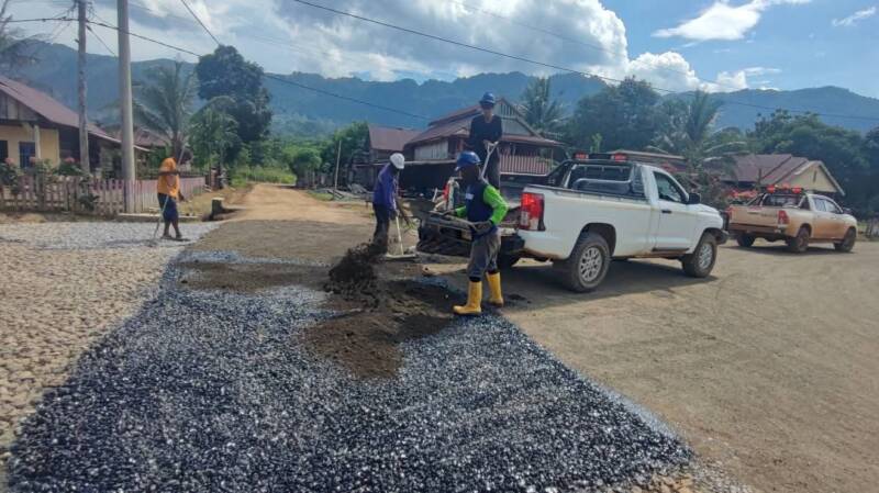 Di lokasi pekerjaan, sejumlah pekerja tampak mulai melakukan penimbunan agregat serta penghamparan material aspal di ruas jalan desa.