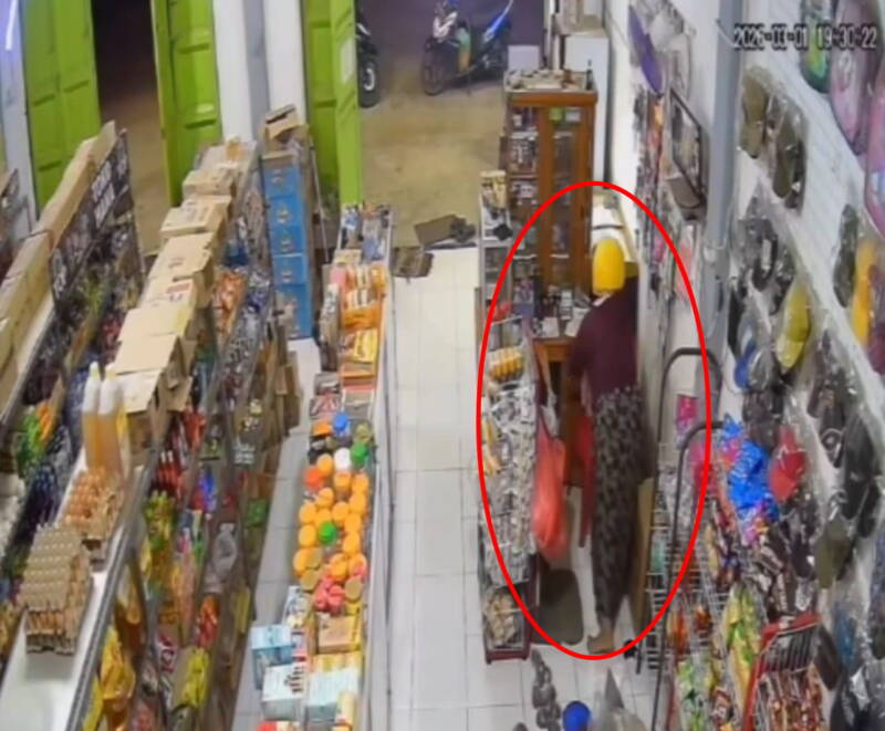 Dalam video tersebut, seorang perempuan tampak menjalankan aksinya dengan tenang dan terencana. Ia mengenakan helm kuning, baju merah tua, jilbab pink, serta rok bercorak hitam.
