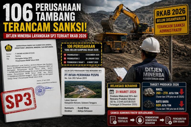 SUARASULTRA.COM | JAKARTA – Nasib operasional sebanyak 106 perusahaan tambang kini berada di ujung tanduk setelah Direktorat Jenderal Mineral dan Batubara (Ditjen Minerba) melayangkan Surat Peringatan Ketiga (SP3) akibat belum rampungnya Rencana Kerja dan Anggaran Biaya (RKAB) tahun 2026.