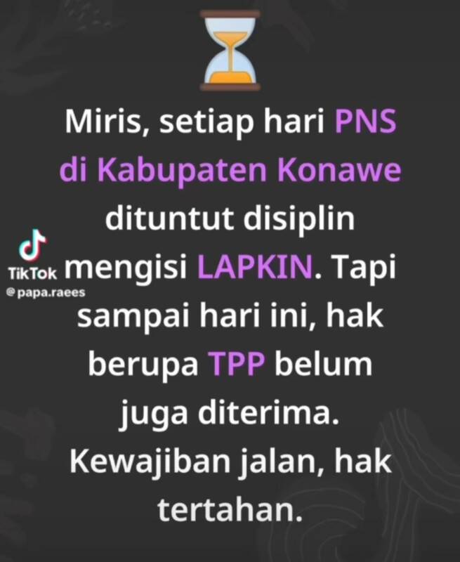 “Miris, setiap hari PNS di Kabupaten Konawe dituntut disiplin untuk mengisi LAPKIN. Tapi sampai hari ini, hak berupa TPP belum juga diterima. Kewajiban jalan, hak tertahan,” tulisnya.