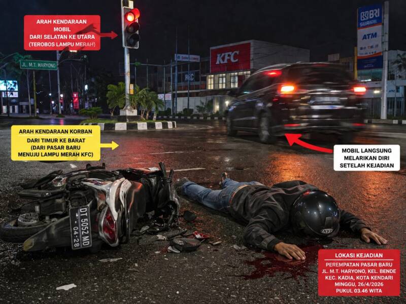 SUARASULTRA.COM | KENDARI – Seorang pengendara sepeda motor dilaporkan meninggal dunia setelah terlibat kecelakaan lalu lintas yang diduga merupakan kasus tabrak lari di kawasan Perempatan Pasar Baru, Jalan M.T. Haryono, Kelurahan Bende, Kecamatan Kadia, Kota Kendari, Minggu (26/4/2026) dini hari.