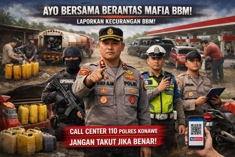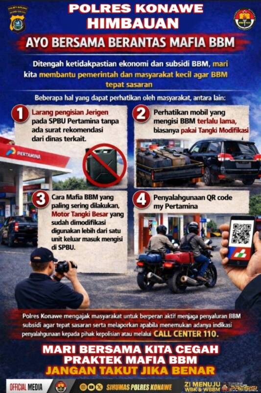 Melalui kampanye publik bertajuk “Ayo Bersama Berantas Mafia BBM”, Polres Konawe menekankan pentingnya pengawasan bersama, terutama di tengah kondisi ekonomi yang dinamis, agar penyaluran BBM subsidi tetap tepat sasaran.